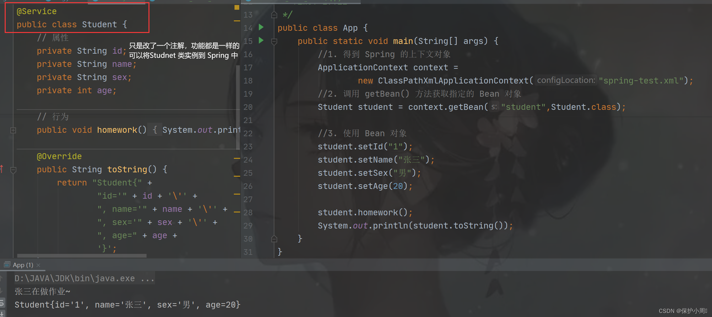 非常的酷,就一个注解 + 设置一下扫描路径搞定啦~ Spring 启动的时候就会自动的将 Student 类实例并添加到 Spring 中。