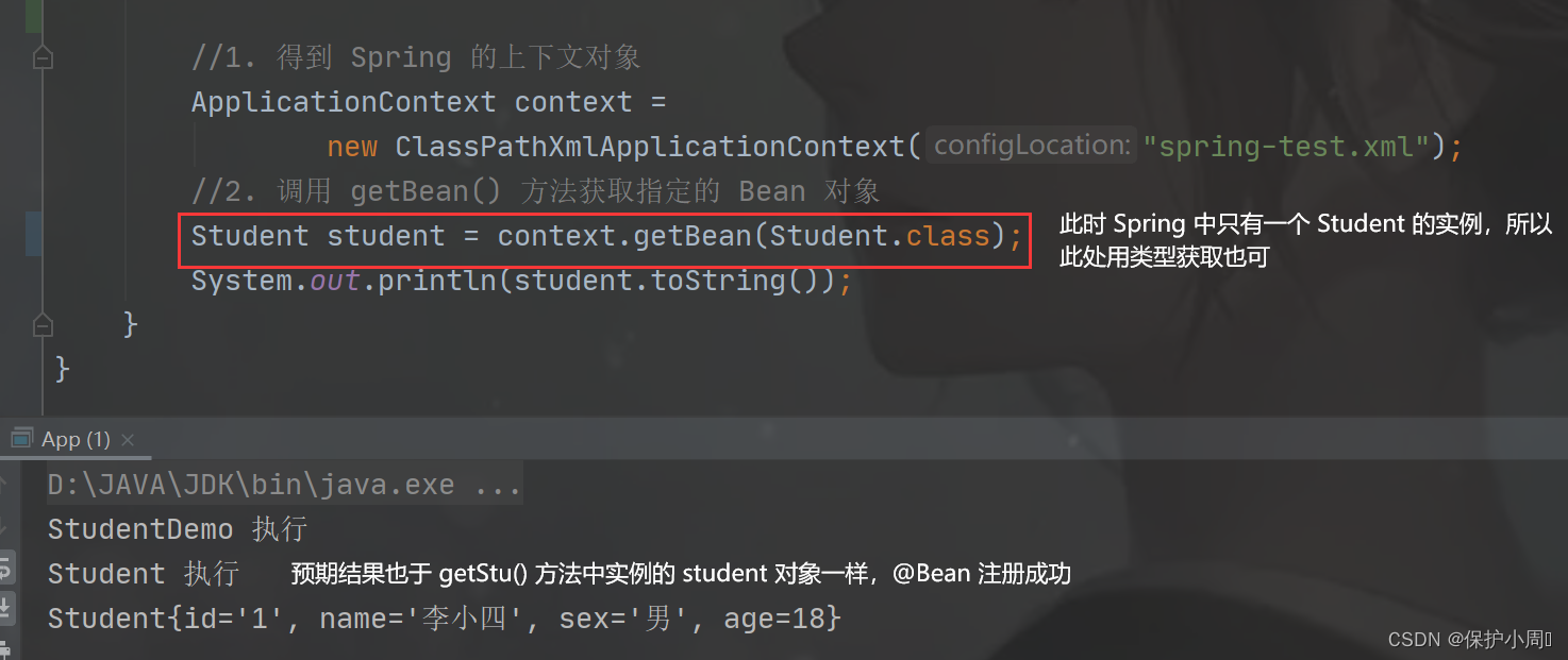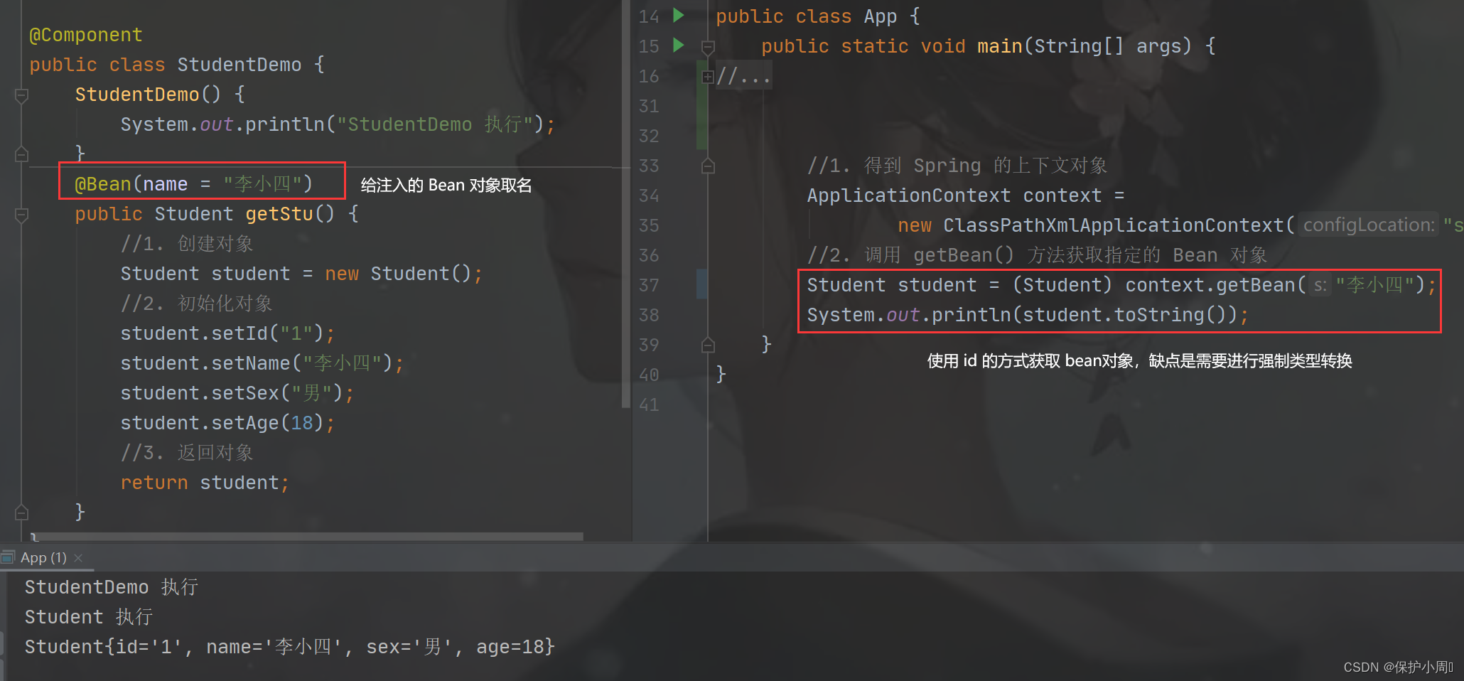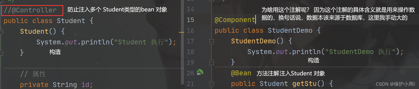 //1. 注入 student 对象,在StudentDemo 类中我们使用 @Bean 注入了两个stu 对象