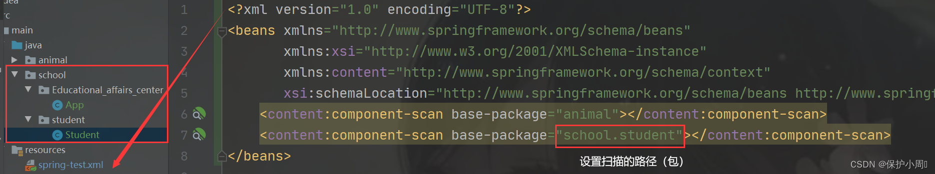 之前我们是在 Spring 配置文件(.xml)中手动添加 Bean 对象,如果使用注解的方法存储我们就只需要配置一下 bean 对象(还未实例)所在的包路径,当 Spring 启动时,上下文对象会根据Spring 配置文件配置的路径进行扫描,只有路径(包)添加了注解的 类、方法才能被正确的识别并实例到 Spring 中。
