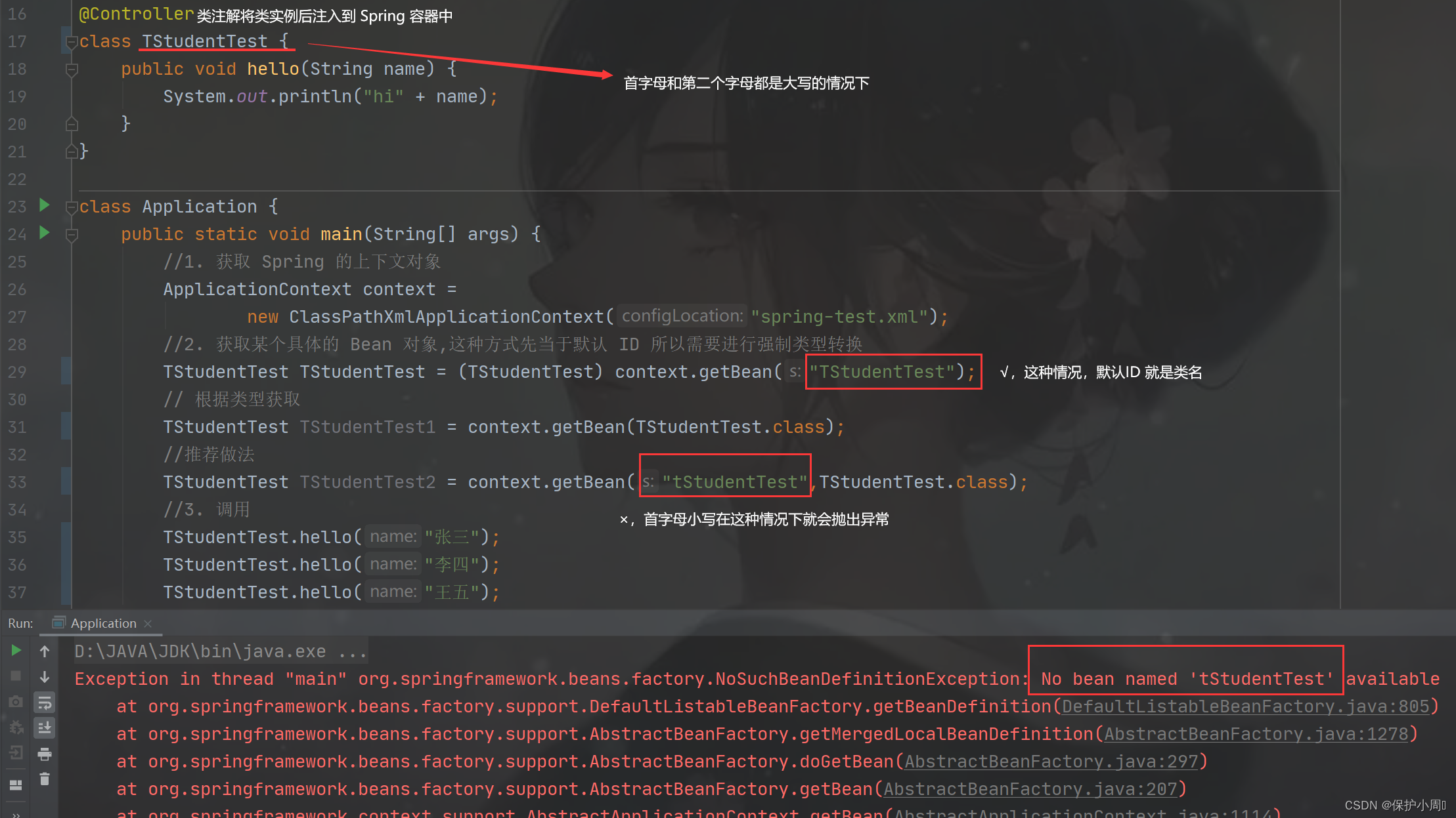 类首字母大写和类首字母小写及第二个字母小写,都是默认都是通过首字母小写作为name 来获取 Bean ;如果类首字母和第二个字母都是大写,那么直接使用原类名作为name 来获取 Bean 。