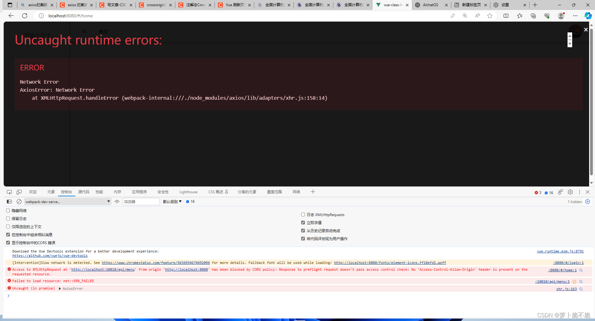 拦截器Interceptor情况下的跨域问题 先看报错信息:这是很常见的一个跨域问题,出于安全原因,浏览器禁止调用驻留在当前原点之外的资源。通俗点来说,就是前端运行的那个端口想去后端服务器运行的端口拿数据,浏览器出于安全问题考虑不会允许这样的事情发生。那我们改如何解决这个问题呢?首先,我们需要先了解一下浏览器是如何产生的这个跨域问题,当我们在前端发送一个跨域请求时,浏览器会先发送一个预检请求(Preflight Request)以确认服务器是否允许不同域之间的请求。