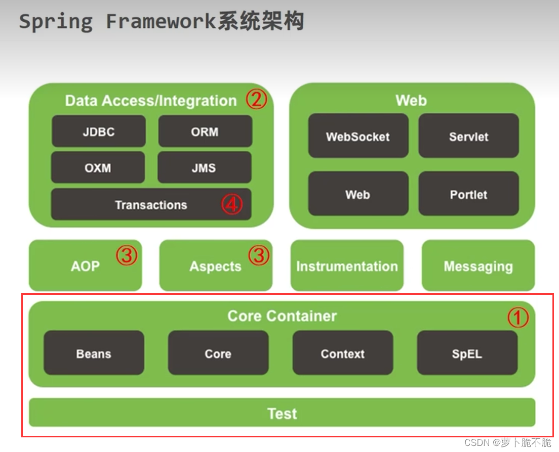 Spring学习笔记 在学习spring之前,我们需要先了解Spring的系统架构,看下图,本文所记录的学习笔记主要是容器(Core Container)、面向切面(AOP、Aspects)、事务(Transactions)、数据传输(Data Access)这几个部分,每一个部分都有他们独特的一些功能作用,下面看详细介绍g)