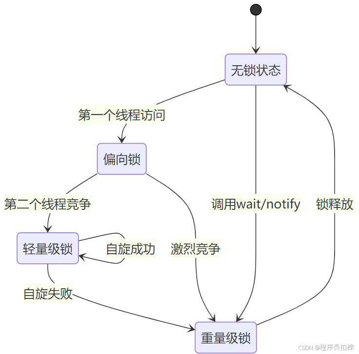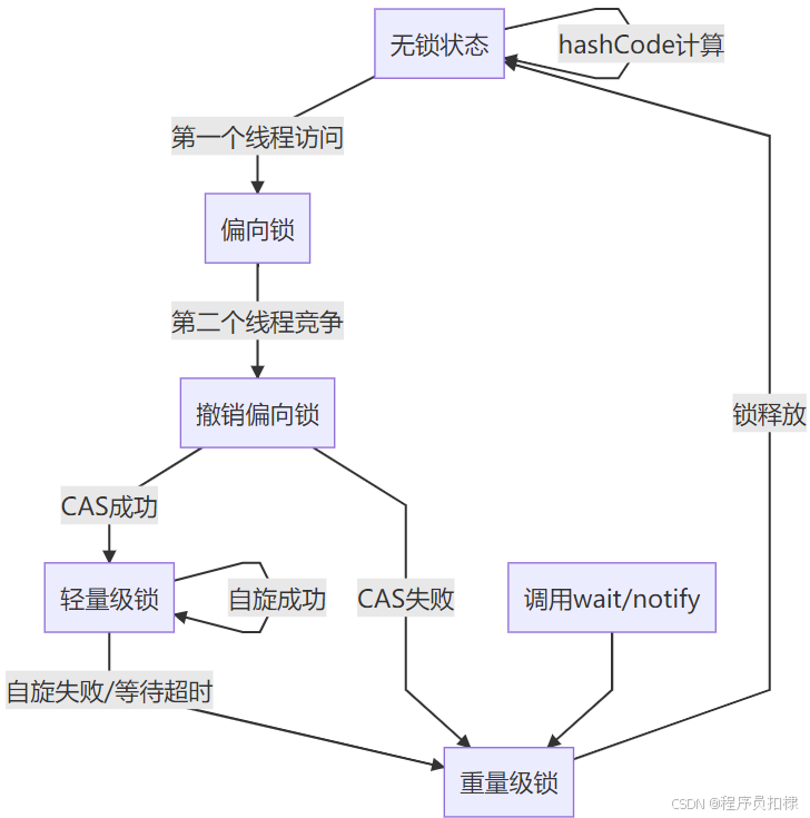 偏向锁→轻量级锁:当有第二个线程尝试获取锁时 轻量级锁→重量级锁:自旋失败或等待线程数超过阈值 直接重量级锁:调用了wait()、notify()等方法