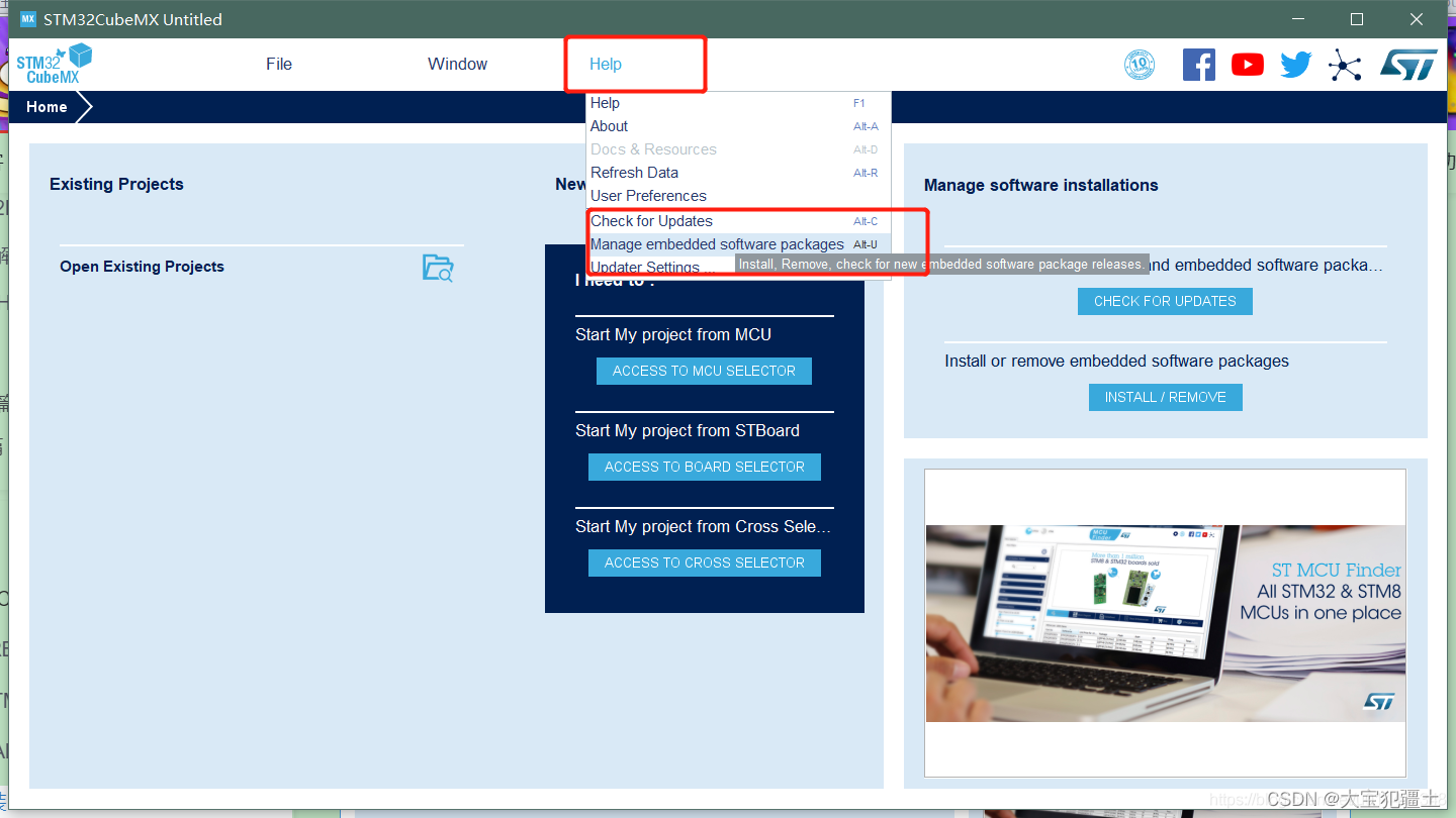 4.1.11 打开安装好的 STM32CubeMX 软件 点上面的Help -> Manage embedded software packages(如果第一打开有提示界面,选最后一个 NO thank 就可以了)