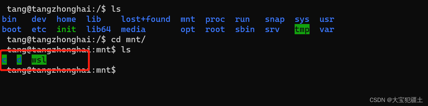 mnt目录下是c盘、d盘,是不是比虚拟机更加的方便,不用使用共享文件夹。