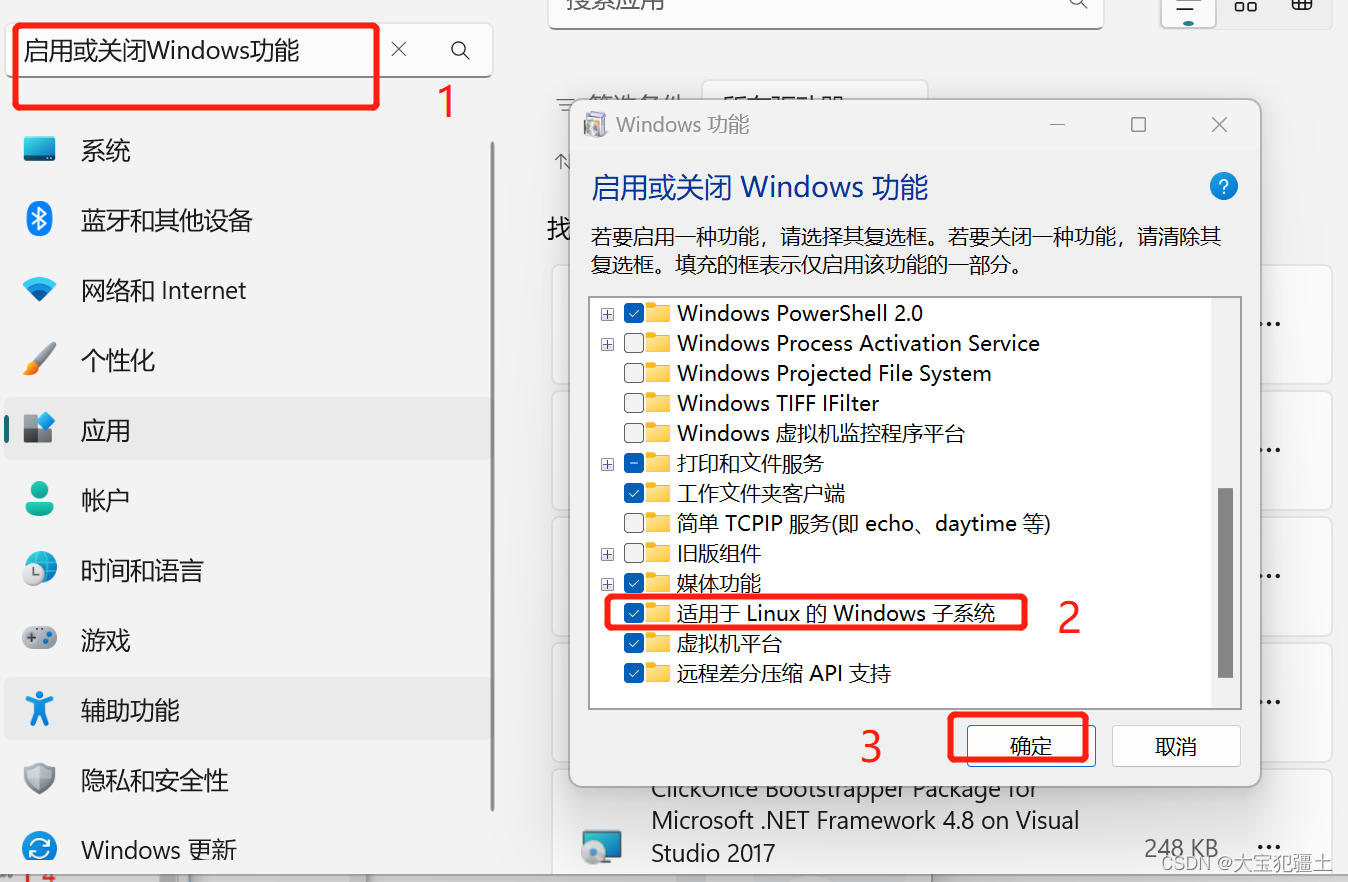 找到设置里面的启用或关闭windows功能,我现在用windows11可能会跟windows10布局不太一样,自己搜一下这个功能开启。