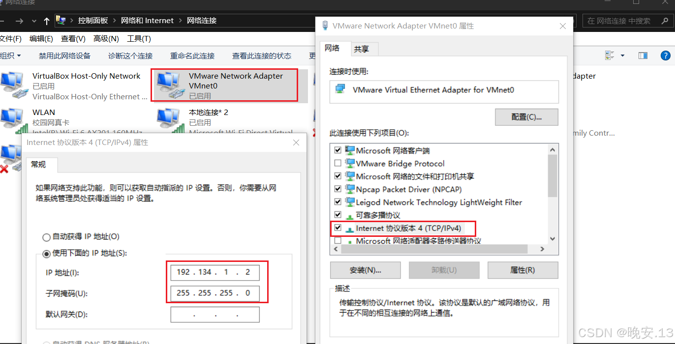 添加三个网络,Vm0,Vm1,Vm2。Vm0和Vm1的类型设置为仅主机模式,Vm2设置为桥接模式,其中Vm0和Vm1的子网地址不做要求。