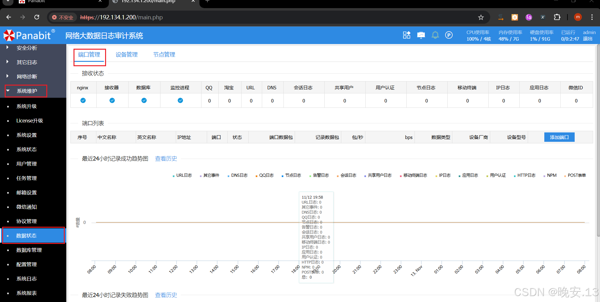 访问Panalog的Web页面,选择系统维护->数据状态。