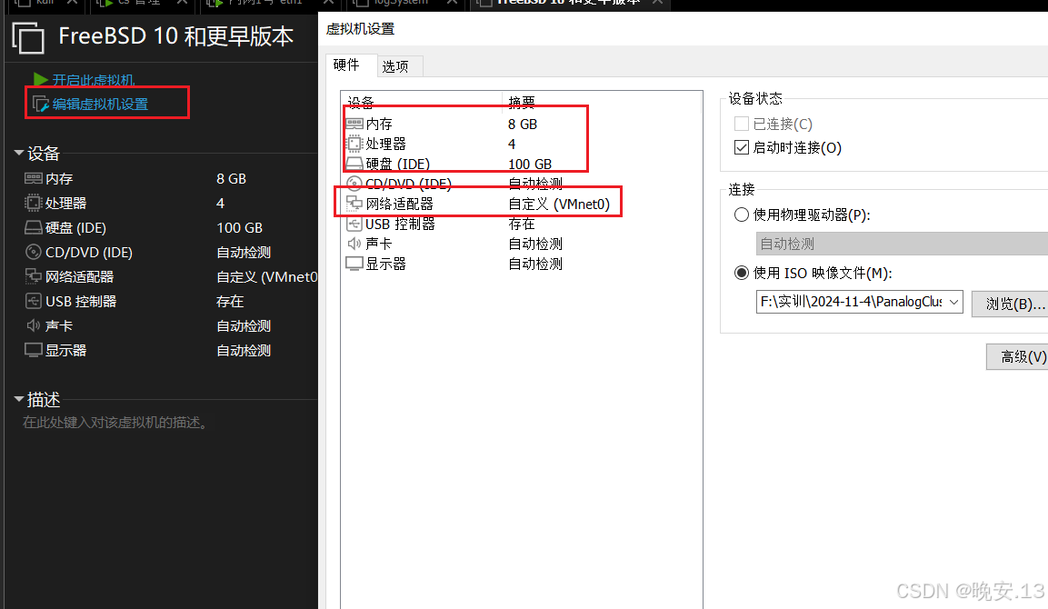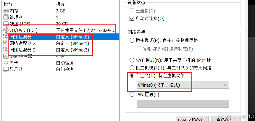 添加ISO镜像,并将三个网卡的网络连接设置为自定义。