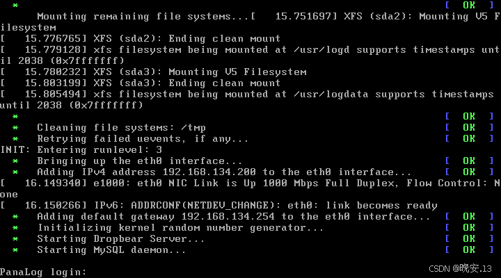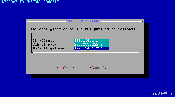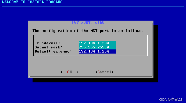 打开Panalog虚拟机,进行配置,一路选择Yes。直到配置IP地址,这里的IP地址与管理的IP地址为一个网段下,网关相同。