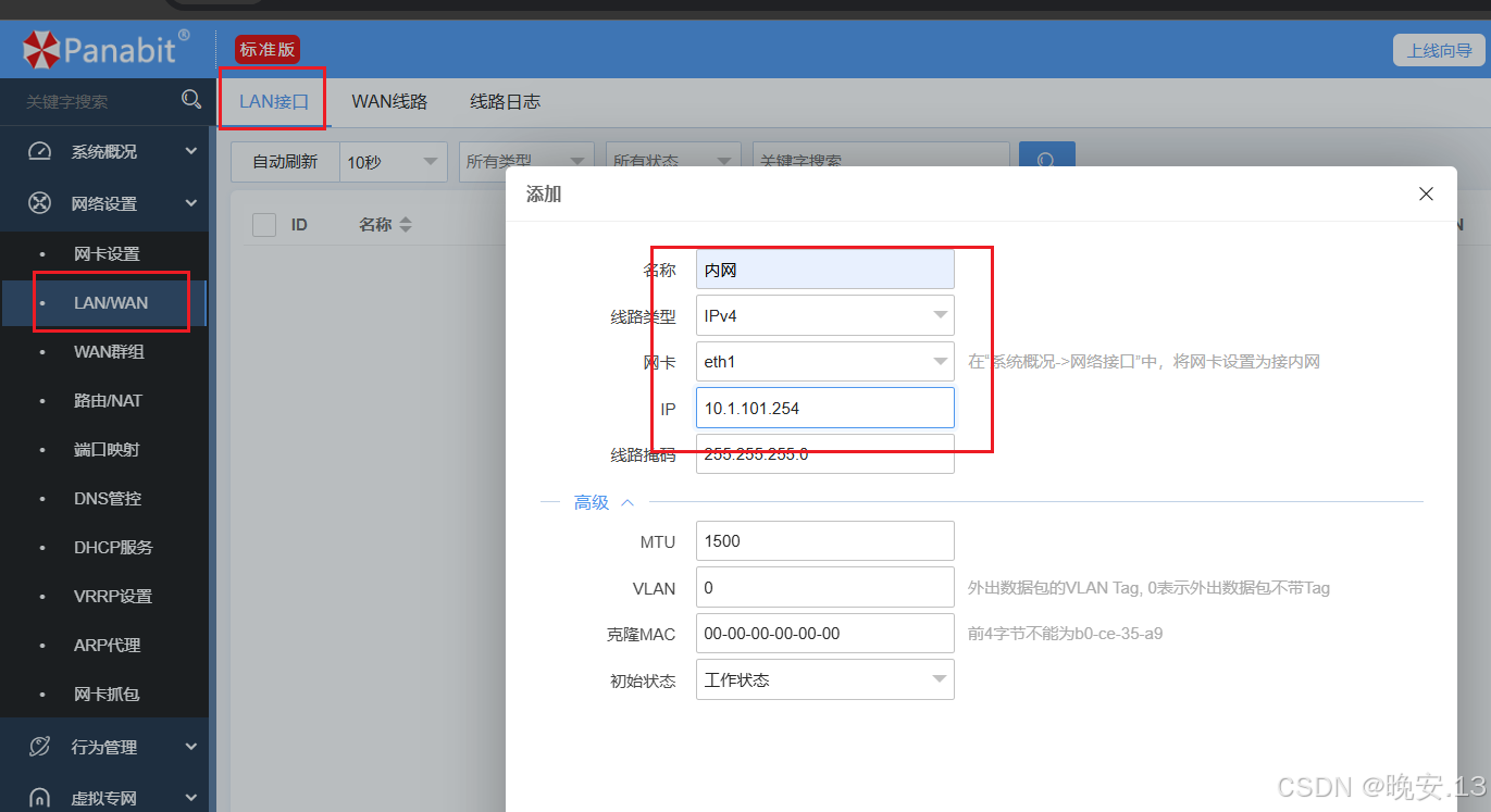 添加Lan接口,该接口做为内网的网关,这里的网关和Win10虚拟机的网关要一致。