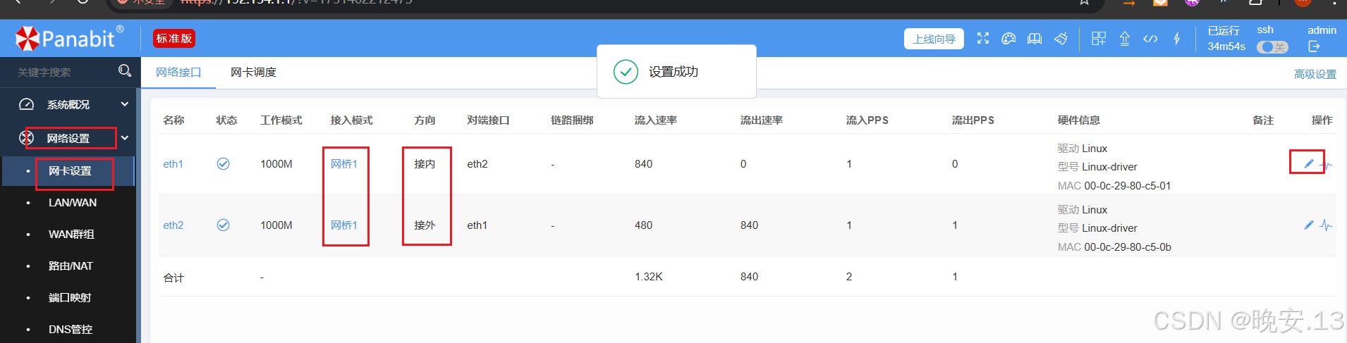 在网卡设置中,将eth1设置为对内,eth2设置为对外。由于Panabit起到透明网桥的作用,因此接入模式设置为网桥,两个网卡的网桥要一样。
