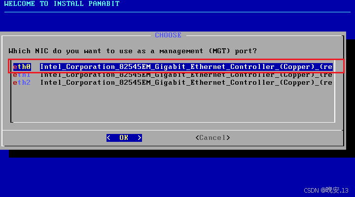然后开启虚拟机,一路选择yes,等待安装。在这个选项中,选择作为管理口的网卡,这里选择eth0做为管理口。