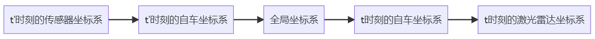 计算各传感器(相机、非关键帧激光雷达)到关键帧激光雷达的坐标变换矩阵(平移矩阵+旋转矩阵):由于各传感器采样数据不完全同步,记传感器采集数据的时刻为t’t’,激光雷达采集数据的时刻为tt,则坐标变换的流程如下