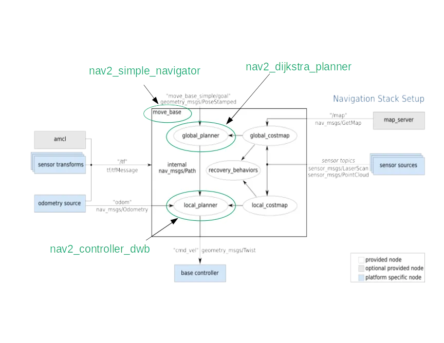 相比于ROS1的navigation而言,ROS2的navigation2已经将move_base 已被分割成多个组件。navigation 2不是一个单一的单体状态机,而是利用行动服务器(action server)和ROS 2的低延迟、可靠的通信来分离概念。行为树被用来协调这些任务。这允许Navigation 2具有高度可配置的导航行为,而无需通过在行为树xml文件中重新排列任务进行编程。