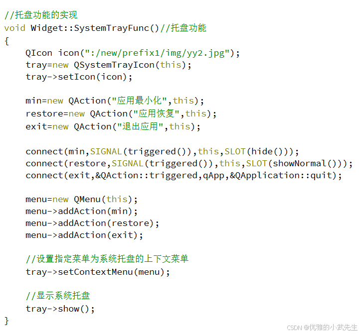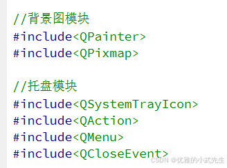 3.在.h文件中声明重写paintEvent函数来实现背景,并重写closeEvent和写一个托盘功能,并声明托盘对象、菜单对象、动作对象