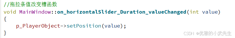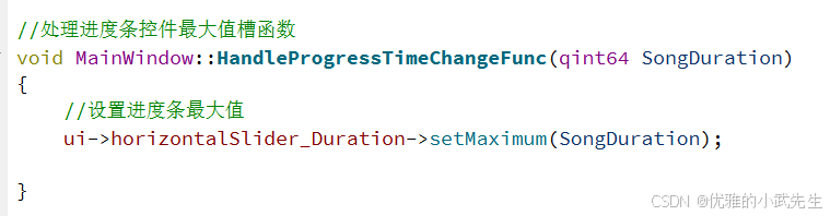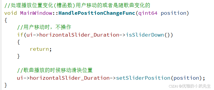 13.完成歌曲进度条随歌曲进度移动的槽函数,并实现用户拖拉歌曲进度条值槽函数,并在构造函数连接信号与槽,每当歌曲在播放的时候,都会自行移动进度条跟上音乐进度,还有用户移动进度条的时候,也会触发槽函数,实现歌曲的进度变化和进度条的位置变化