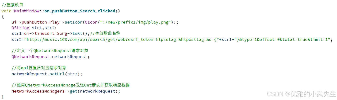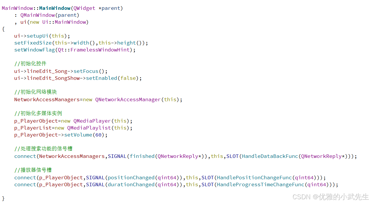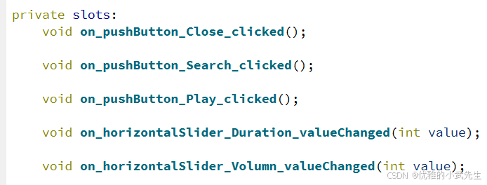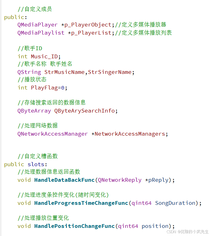 7.自定义成员变量和槽函数,用于实现播放进度条、音量进度条、搜索获取API音乐数据信息等