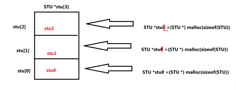 stu[i] = (STU *)malloc(sizeof(STU)); // 数组中每个成员在堆区