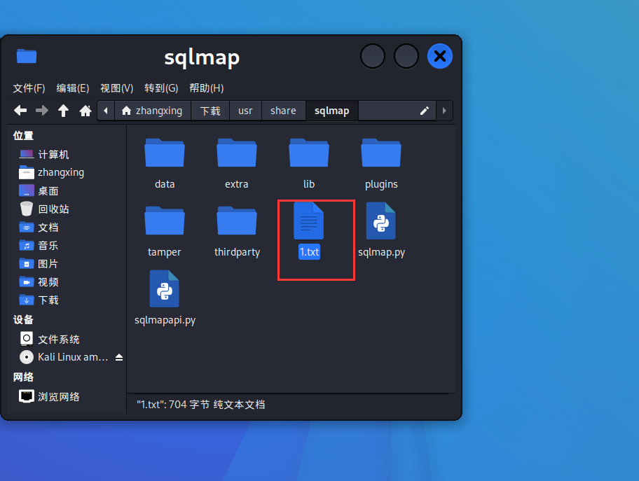 注意:千万要将新建的文件放在sqlmap的目录内,目的是为了让sqlmap读取新建文件