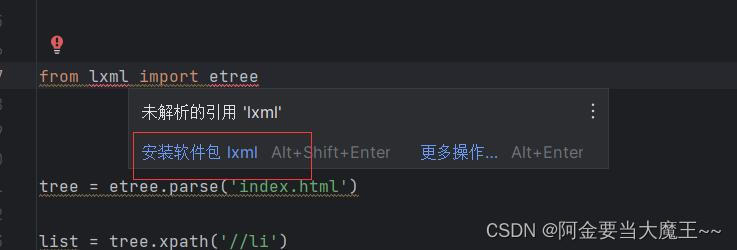 打开pyCharm 输入 from lxml import etree 如果报错 就点击安装(我这个就是没安装成功)