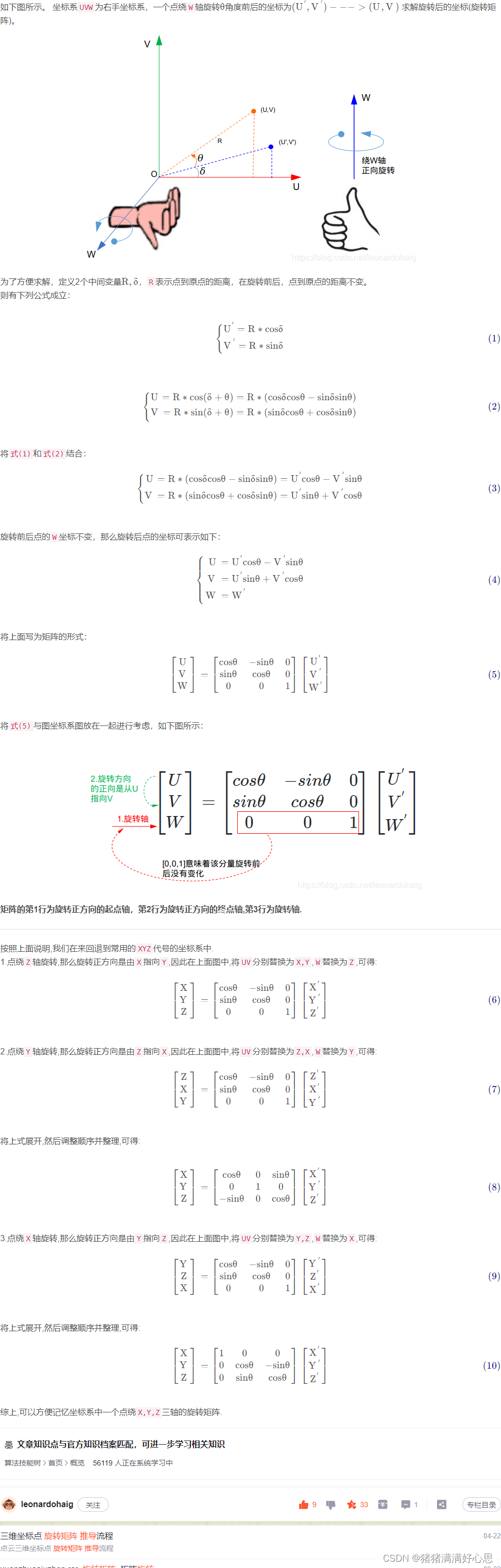 【转载】点绕坐标系旋转旋转矩阵推导、理解 开会过程中,翻笔记本时突然发现了之前推导的点绕坐标系旋转的旋转矩阵求解过程。在直觉上,一个点绕3个坐标轴旋转的旋转矩阵在形式上看起来是一致的,观感上比较优雅、整齐,但是一直没有仔细观察背后的原理。因此又对这个过程进行了一次推导,对这种整齐有了更深的理解,同时对记忆也有所帮助。转载,用检查导出的html图片丢失了,索性直接截图了。三个字母代替3个轴,为了不失一般性,避免字母先入为主产生的印象,在这里用。大拇指指向轴线方向,四指方向为旋转的正方向。由于我们提到三维坐标系时,常用。为右手坐标系,一个点绕。