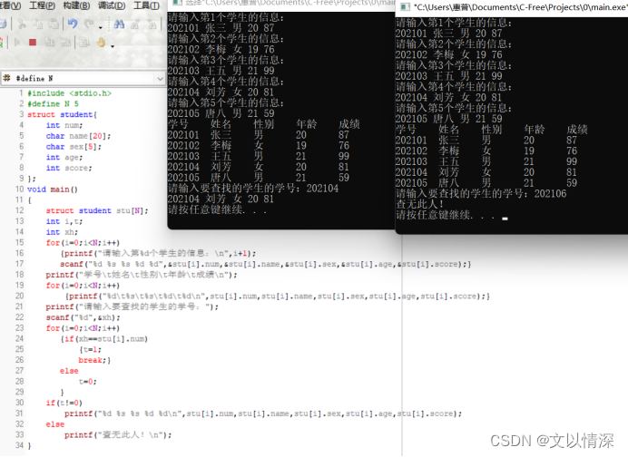 (2)输出指定学号学生的所有数据信息。(用结构体数组保存学生数据,采用顺序查找。)