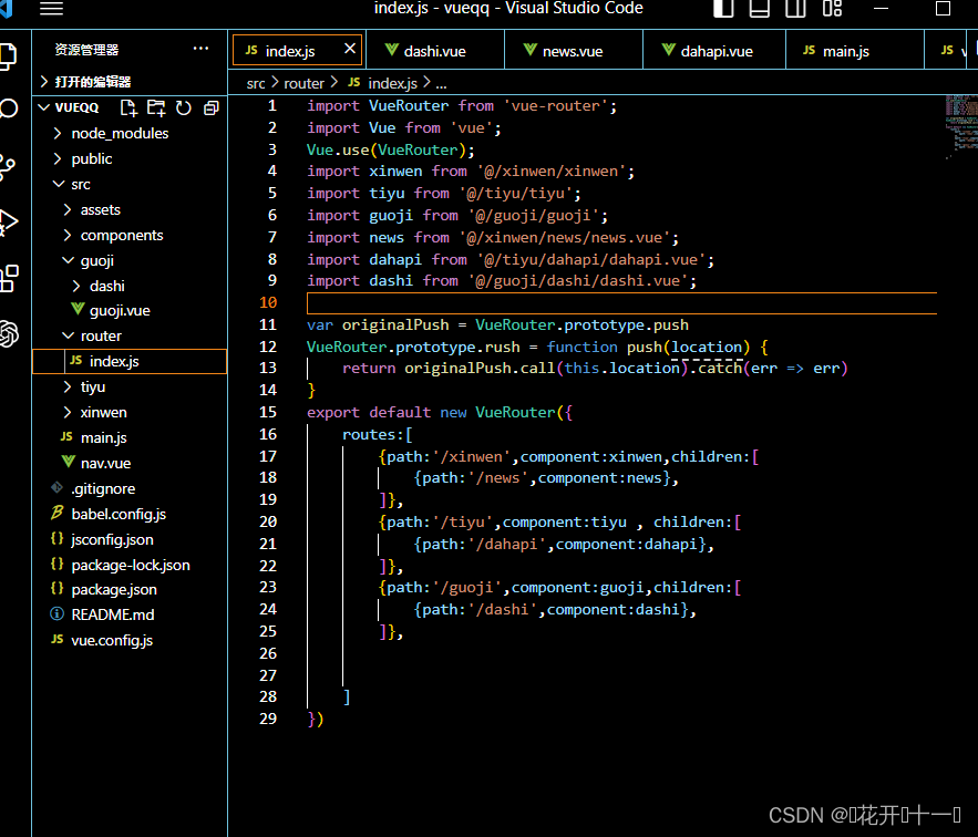 如果在一个项目中使用它 ,必须通过 Vue.use()明确安装路由功能,用vue-cli生产了项目结构,src文件目录下会有一个router文件夹,此处就是用来编写路由组件的地方。在scr/router/index.js,这个文件解释路由的核心文件: