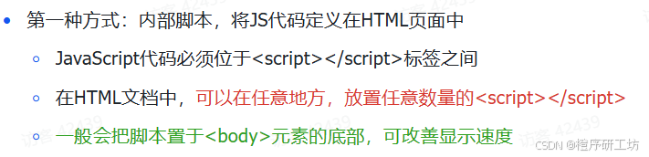 同样,js代码也是书写在html中的,那么html中如何引入js代码呢?主要通过下面的2种引入方式: