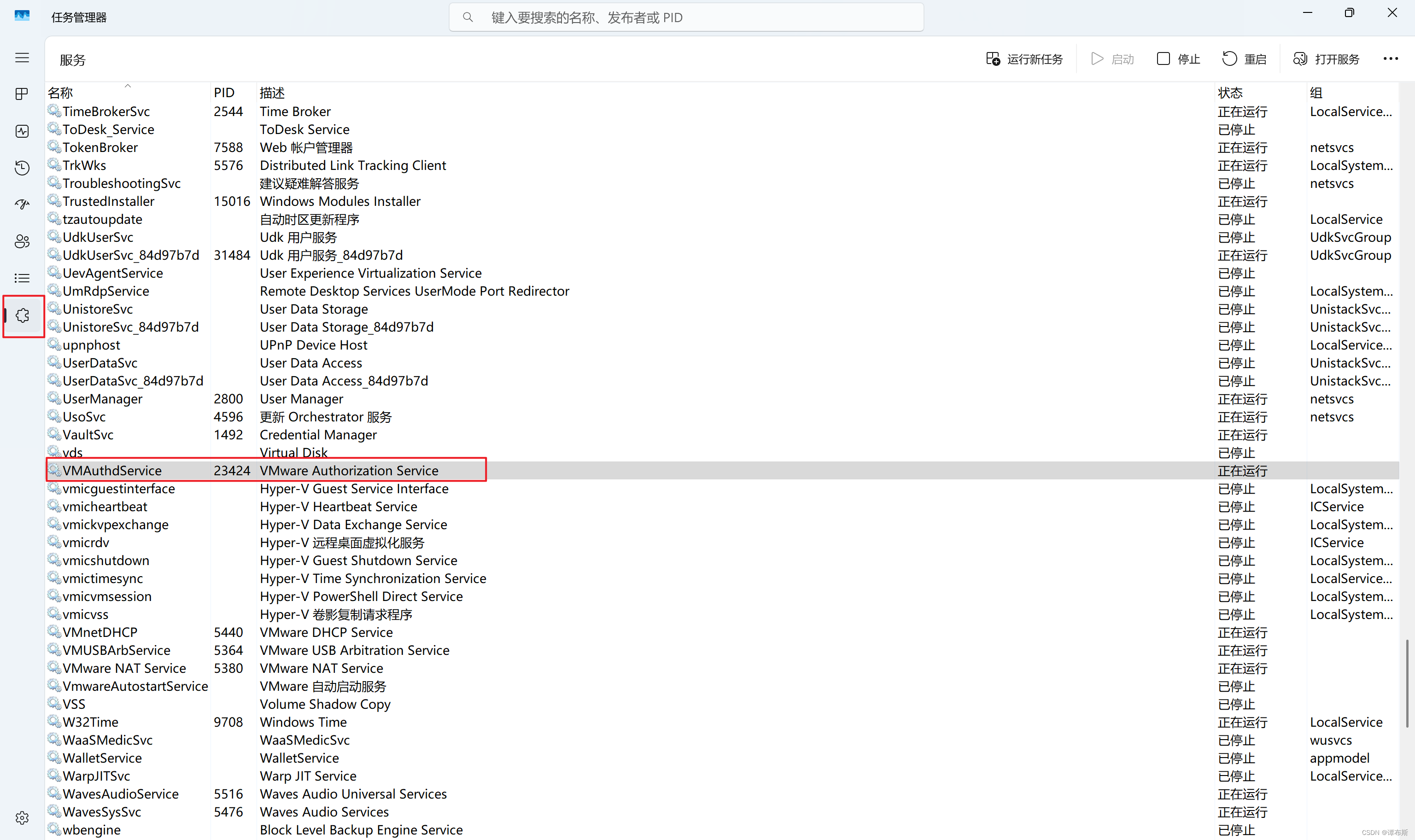 3.在任务管理器的服务页面找到VMAuthdService停止,再重新运行