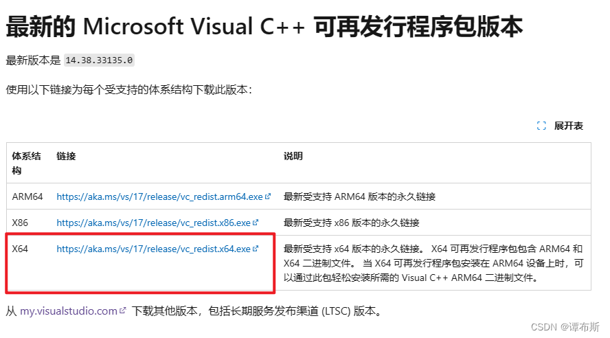 1.使用此链接最新受支持的 Visual C++ 可再发行程序包下载 | Microsoft Learn打开微软官方网站下载Microsoft Visual C++ X64版本,并进行安装