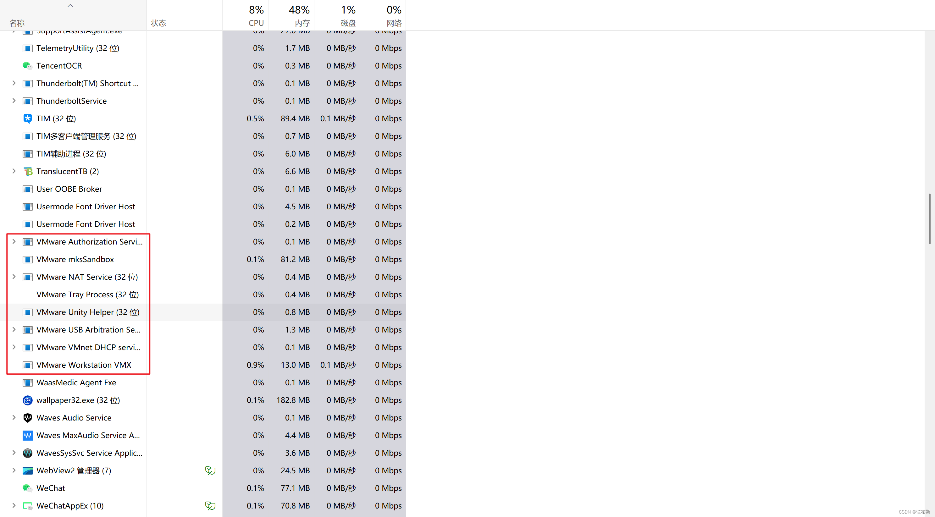 2.打开任务管理器,把相关于VMware的所有进程结束
