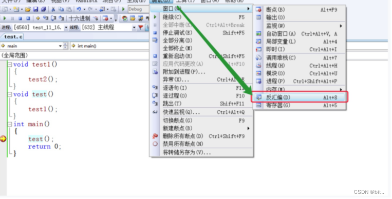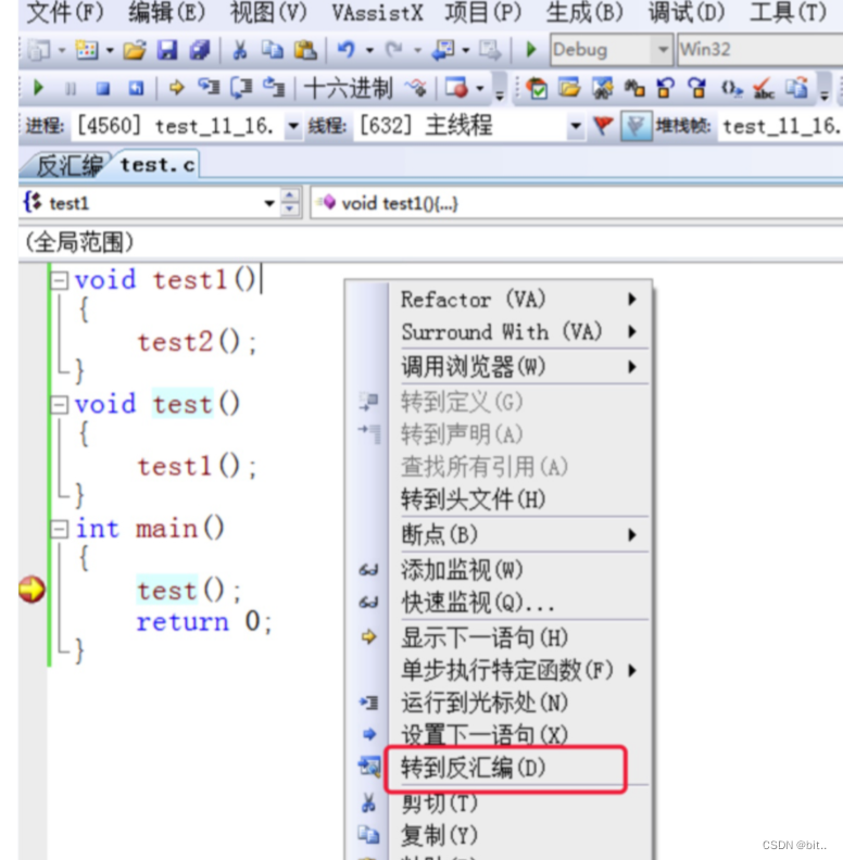(1)第一种方式:右击鼠标,选择【转到反汇编】: