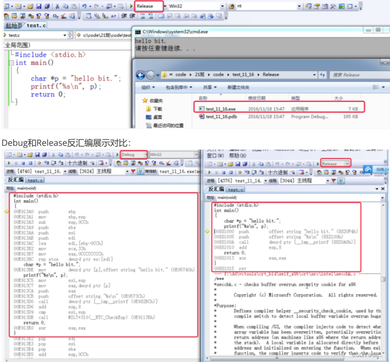 Debug 通常称为调试版本,它包含调试信息,并且不作任何优化,便于程序员调试程序。 Release 称为发布版本,它往往是进行了各种优化,使得程序在代码大小和运行速度上都是最优 的,以便用户很好地使用。