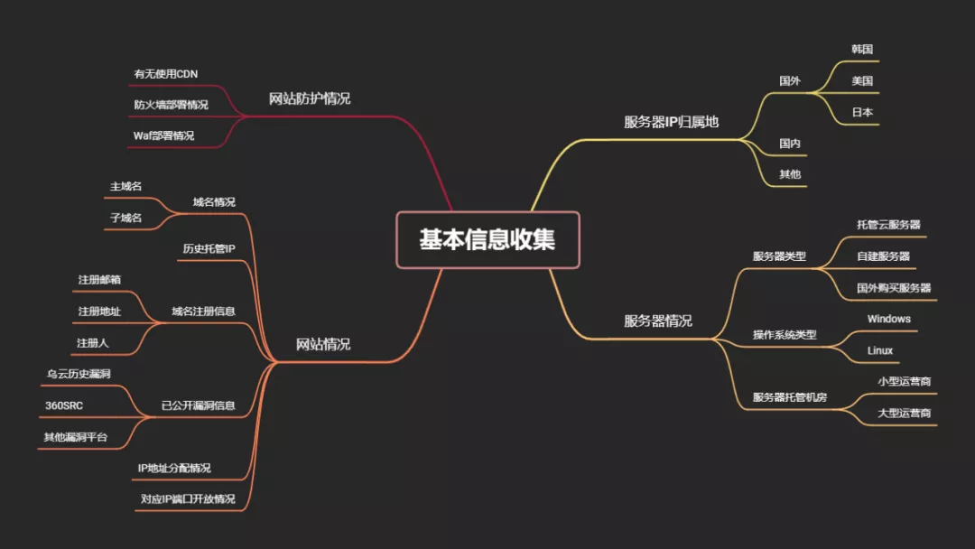 基本信息收集主要真的目标进行各种信息收集,收集越多,在制定渗透计划是越完善,主要收集以下信息: