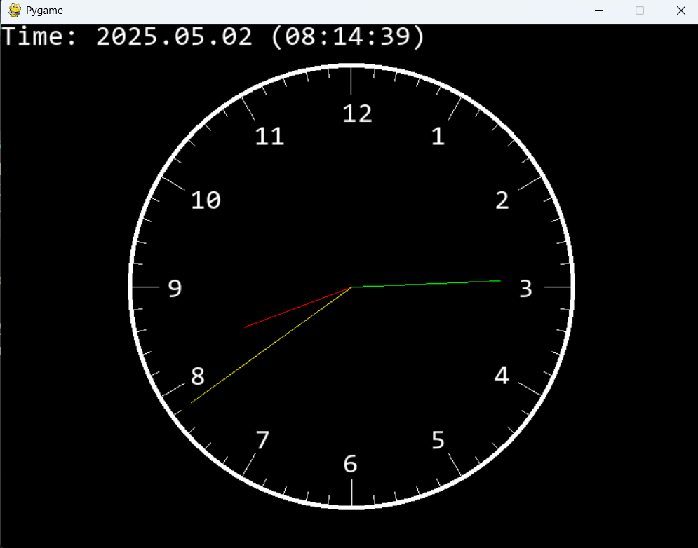 pygame.draw.line(screen, color, (400, 300), (400 + math.sin(math.radians(angle)) * radius, 300 - math.cos(math.radians(angle)) * radius)) #指针