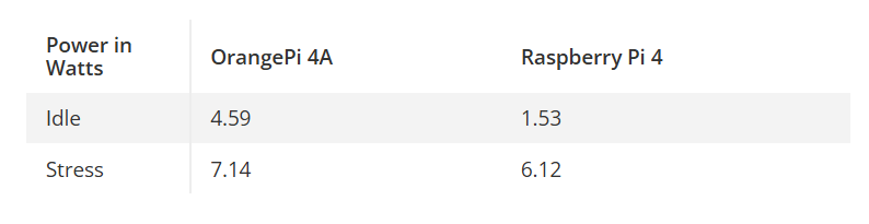 空闲状态下的功耗是树莓派4的优势所在,仅消耗1.53瓦,而OrangePi 4A则达到4.59瓦。需注意OrangePi 4A的CPU核心数是树莓派4的两倍。在负载测试中,其功耗表现与CPU温度情况相似。OrangePi 4A功耗达7.14瓦,树莓派4为6.12瓦,两者仅相差1瓦出头。