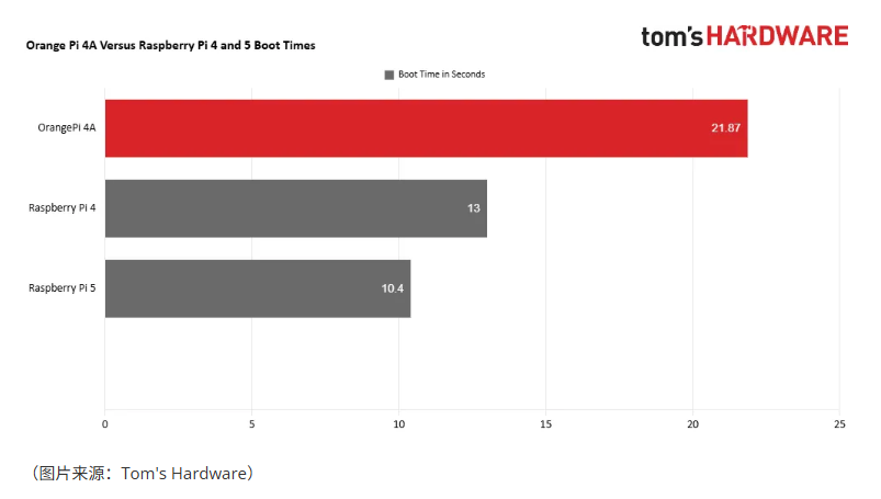 OrangePi 4A的性能介于树莓派4 4GB与树莓派5之间。本次测试使用A2级micro SD卡运行Debian操作系统。