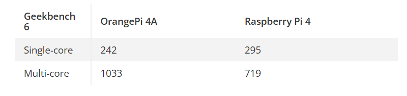 通过Geekbench 6测试了CPU性能,由此可见OrangePi 4A与树莓派4之间存在差异。
