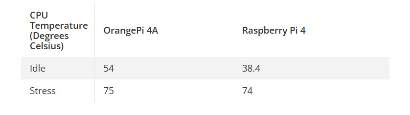 OrangePi 4A在高负荷状态下的表现如何?它确实会发热,而且开机时温度就很高!机箱内未配备散热片或主动散热装置,但设有5V风扇接口。开机待机时,OrangePi 4A温度即达54摄氏度,而树莓派4仅为38.4摄氏度。在满载测试中,尽管OrangePi 4A拥有双倍CPU核心,两者温度表现却几乎相同:五分钟满载测试后,前者达到75摄氏度,后者为74摄氏度。