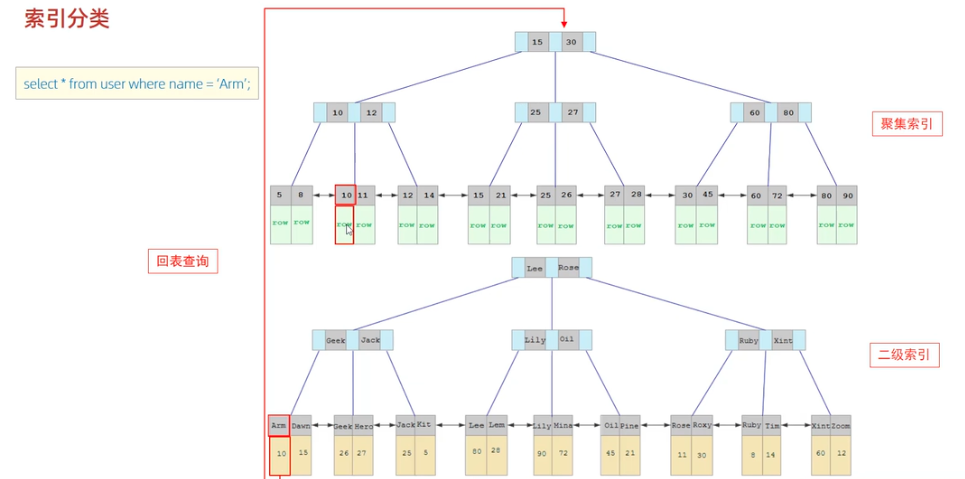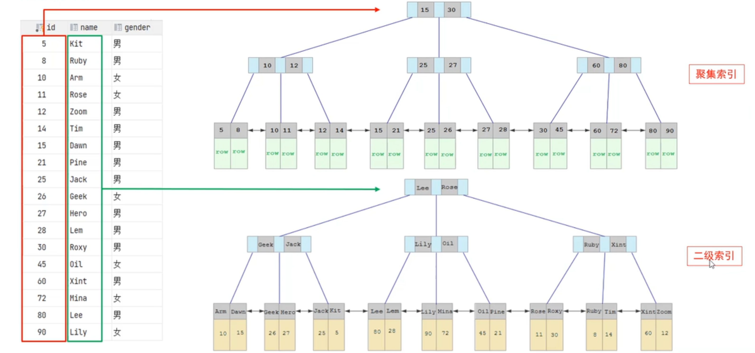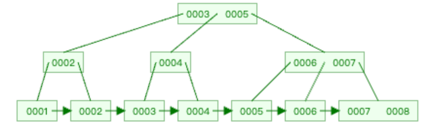 - 而在B+树中,只有叶子节点存储了实际的关键字和数据。内部节点只存储关键字(不包括最终数据),用于指向下一个节点。