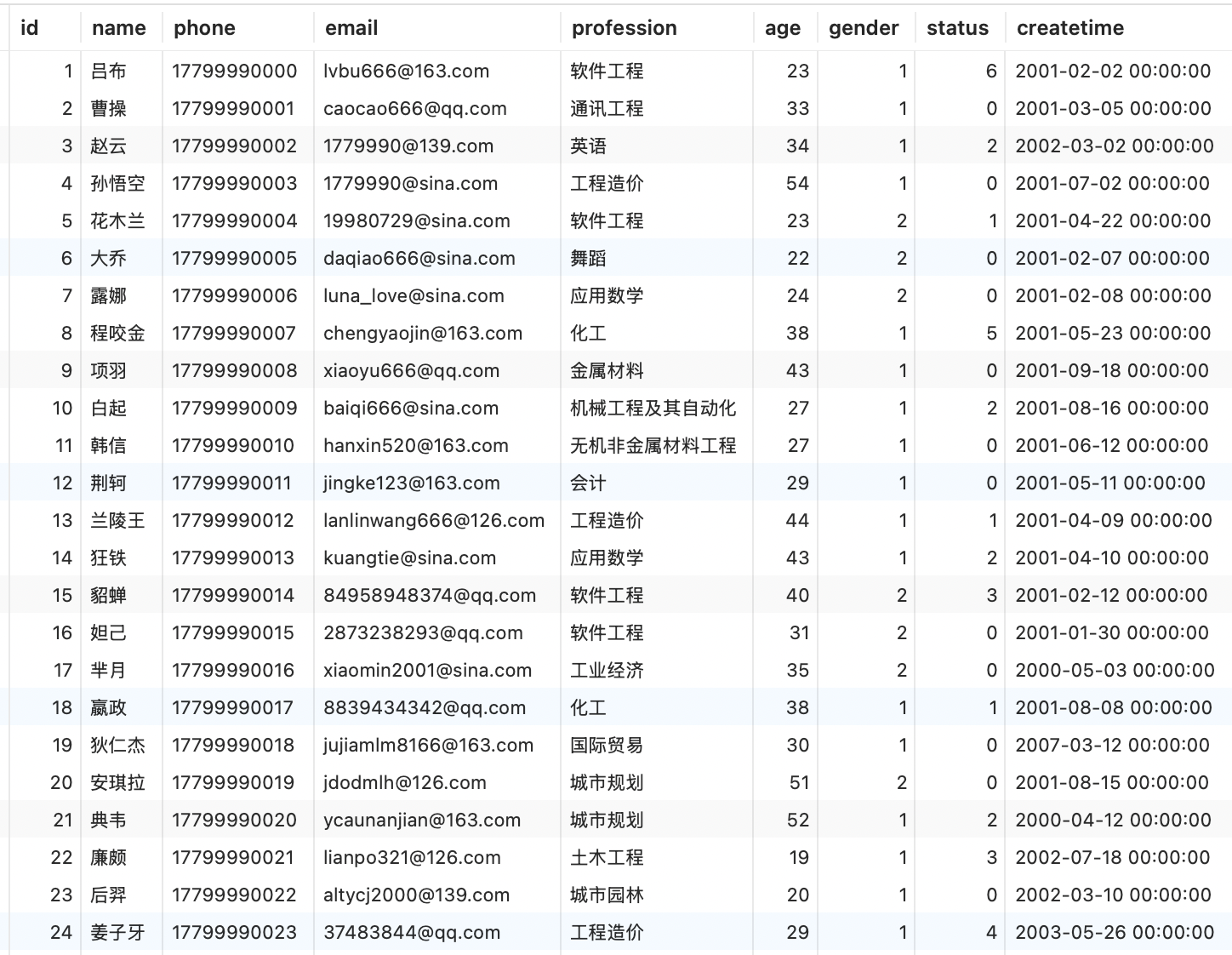 -- 批量添加指定字段 INSERT INTO 表名(字段1, 字段2, ...) VALUES (值1, 值2, ...), (值1, 值2, ...), (值1, 值2, ...); -- 批量添加全部字段 INSERT INTO 表名 VALUES (值1, 值2, ...), (值1, 值2, ...), (值1, 值2, ...); - 注意: