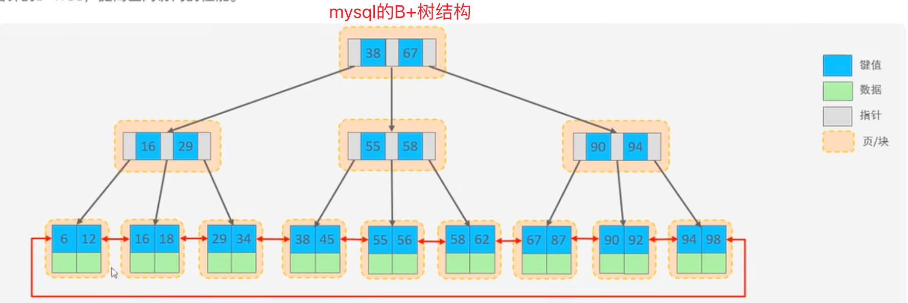 - B+树的叶子节点之间通过指针相连,形成一个链表结构,这使得范围查询更加高效。