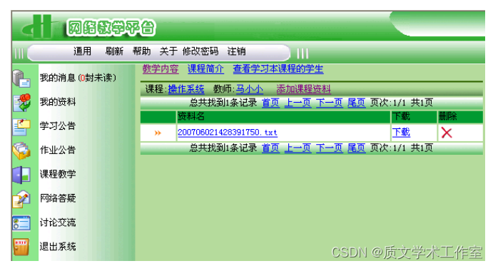 (1) 课程学习与课程教学设计:课程资料在本系统中,设计成与开课信息关联,首先要在系统添加了开课信息之后,才能添加课程资料,开课信息由管理员添加,课程资料信息由教师添加,学生可以下载。在本系统设计中,权限分配是这样的,老师只能添加自己所任教的课程的学习资料,没有任教的课程不能添加。学生只能下载与自己有关的课程的学习资料。