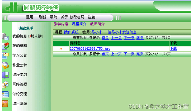 此功能顾名思义就是给学生提供学习资料的,以文件的形式。但以文件的形式组织学习资料,在内容上对于学生来说,有时并不是很方便,但现在也没有什么好的解决的办法,期待有新的解决办法来解决此问题。在资料查找方面,文件资料在网站站内搜索一般都只能做到以文件名到网站数据库中搜索,并不能查询到文件中的内容,给学生进行文件查找带来很大的麻烦,在得到搜索的结果的时候,往往发现根本不是自己想要内容。