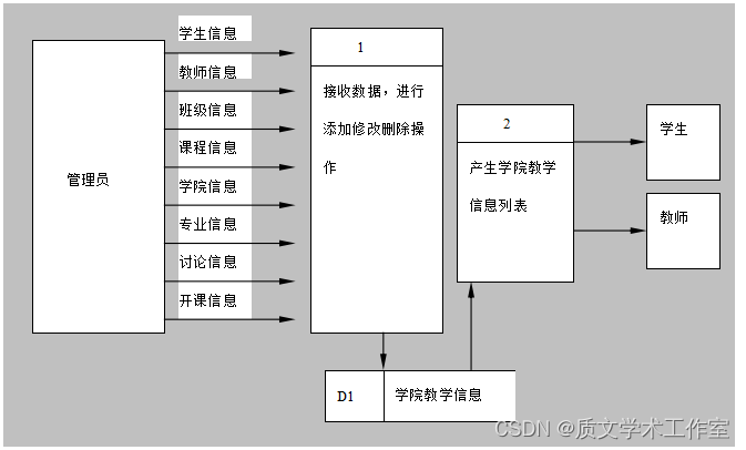 在本系统中,有四类数据流图:和管理员相关的,和教师相关的,和学生相关的和短消息相关的。