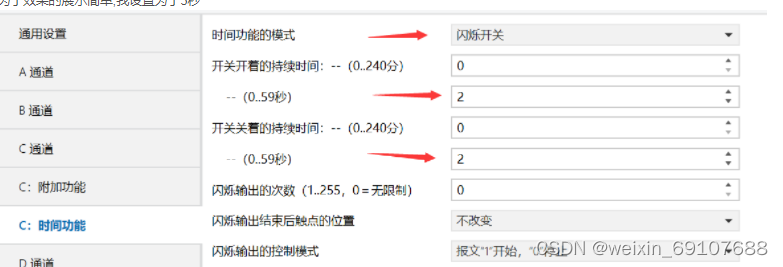 参数“开关开着的持续时间: 分 (0...240), 秒 (0...59)” 该参数定义在闪烁输出时开关延时打开的时间。 可选项: 0...240 分 0...59 秒 值得注意的是,只有低于继电器限定的开关频率才会被执行。因为频繁的切换开关,可能 使继电器没有足够的能量来执行动作,这就可能发生执行动作的延时。 这同样也会发生在总线恢复供电后。为使设备正常工作,这里的延时时间至少在2s以上。