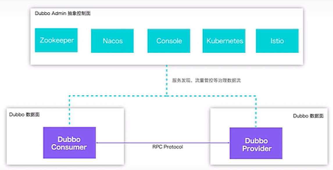 在数据面,使用Dubbo开发的微服务进程间基于RPC协议通信,由一系列可选的微服务治理组件构成