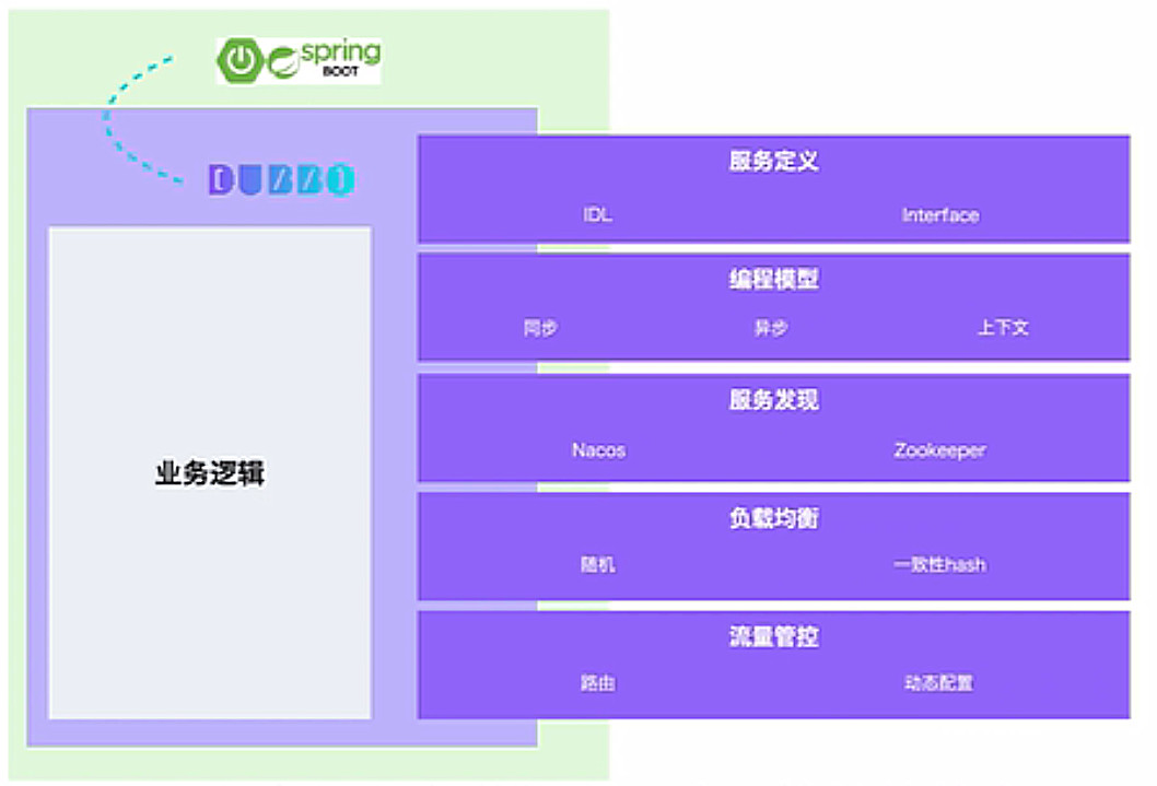 Dubbo不是应用框架的替代者,它可以很好的工作在每种语言的主流编程框架之上,以Java为例,Dubbo可以很好的与Spring协作,并在此基础上提供服务定义、微服务编程、服务发现、负载均衡、流量管控等能力