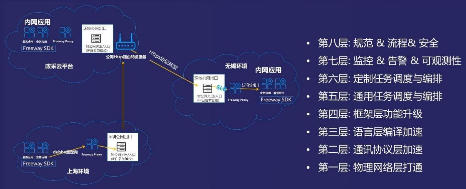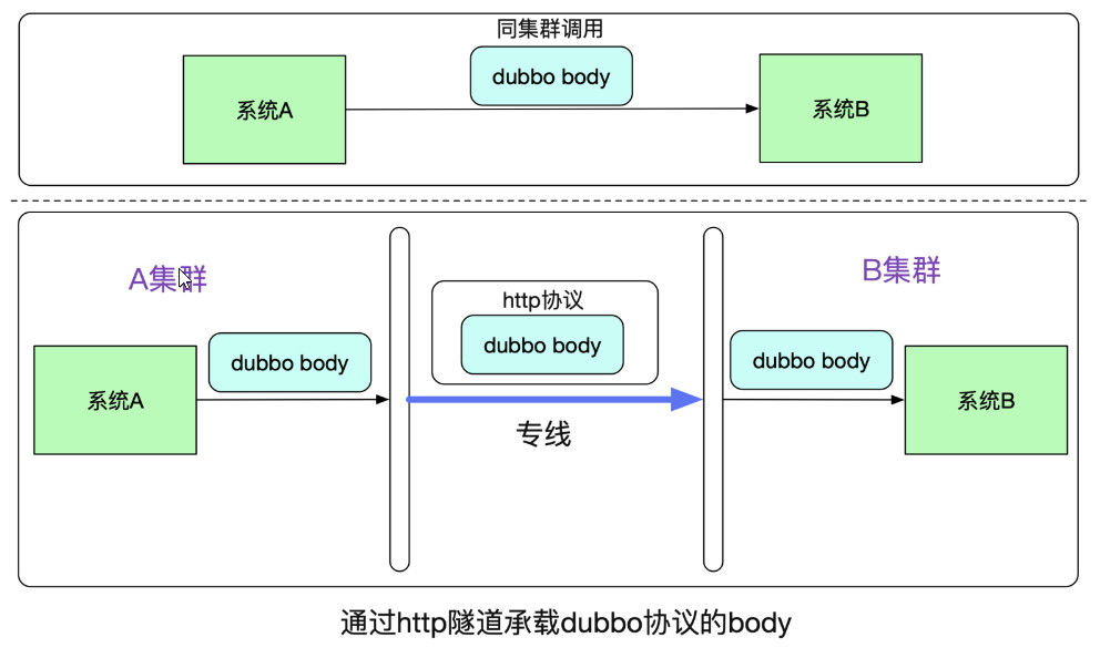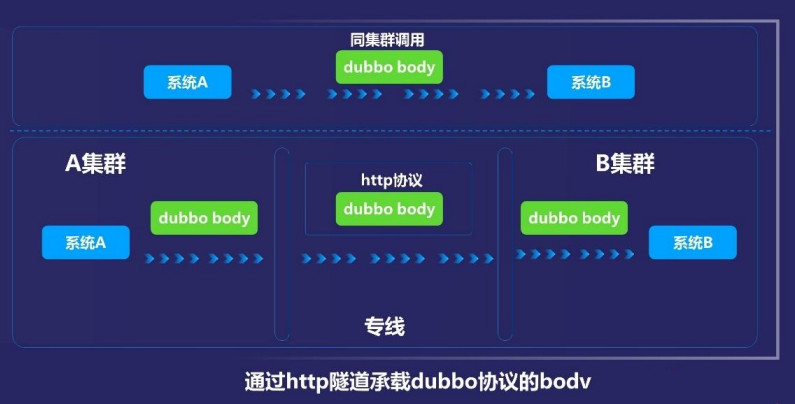 高速公路架构中,使用了隧道这个概念。两端(业务层)是 Dubbo 私有协议,跨网传输过程中,则使用了 http 协议,http 协议可以更好的被中间设备、网关识别转发。这个机制的最大便利在于对业务的低侵入性。对于业务集群的应用完全不需要修改。